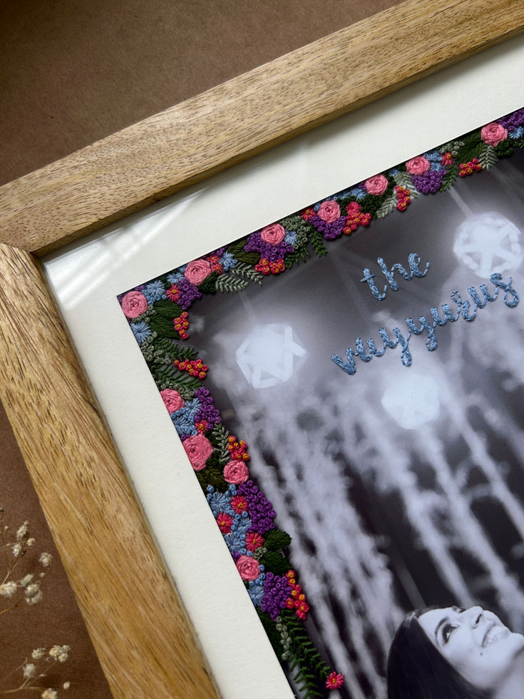 Celebrate love, memories, and craftsmanship with this exquisite hand-embroidered photo frame. Featuring a three-sided floral embroidery design, this frame beautifully blends artistry and emotion, making it a perfect keepsake for cherished moments.Each delicate stitch—from woven wheel and French knots to satin stitches and intricate variations—adds depth and texture, creating a vibrant, joyful aura. The rich palette of blooming florals and lush greenery enhances the elegance of the monochrome photograph, making it a striking fusion of modern minimalism and timeless embroidery traditions.Encased in a rustic wooden frame, this handcrafted piece makes for a thoughtful gift for weddings, anniversaries, or housewarmings, or simply as a heartwarming addition to your home décor.Personalization Available! Customize with names, dates, or special messages to make it truly one-of-a-kind