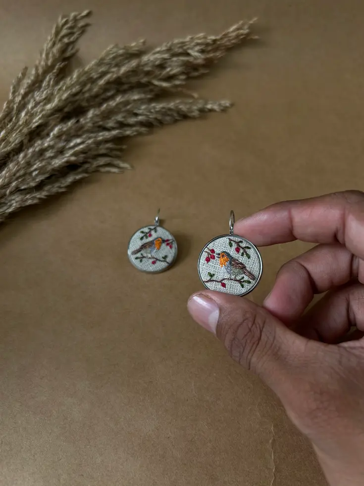 Inspired by the gentle presence of the robin resting on a cherry branch, this pair captures a quiet moment from nature. Each earring is hand embroidered on linen fabric using fine Anchor cotton threads and set in a 2.5 cm stainless steel base.