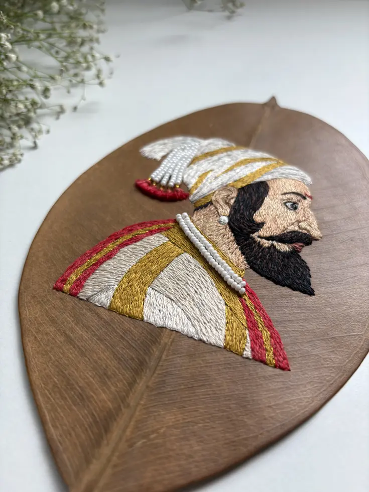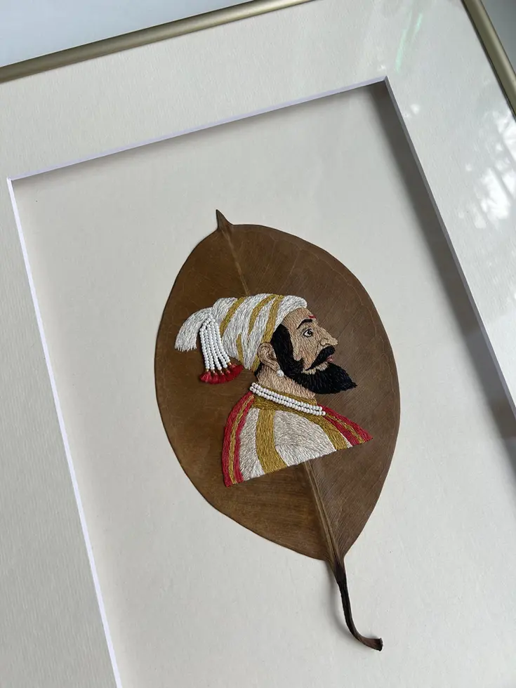 Embroidered Recreation – A handcrafted tribute to Chhatrapati Shivaji Maharaj, honoring his valor and vision through the delicate medium of needlework on a natural leaf.