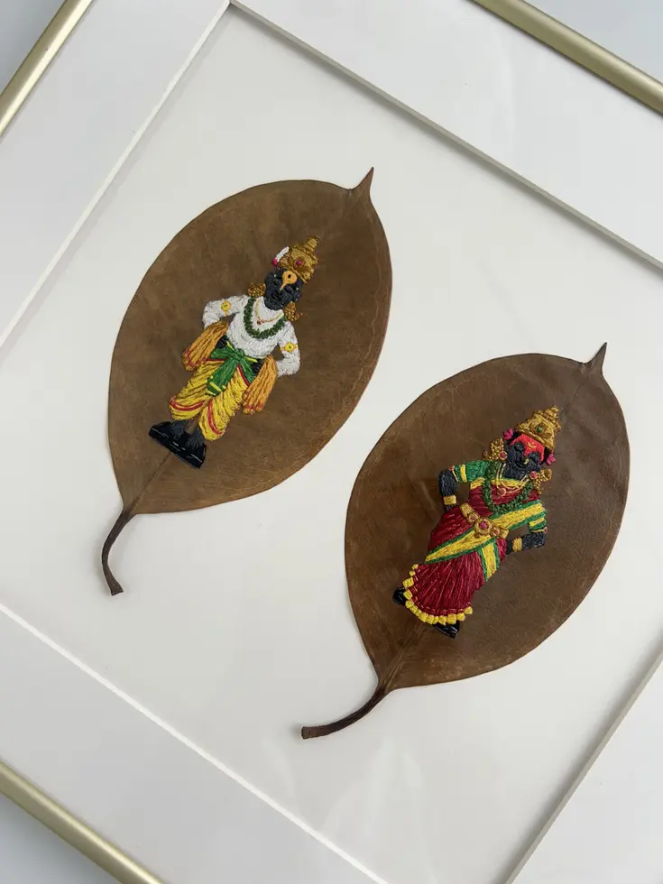 It features intricate hand embroidery of real dried leaves. The piece is framed in a premium German metal frame with a matte gold finish, measuring 14 x 13 inches, including a 2 inch mount.